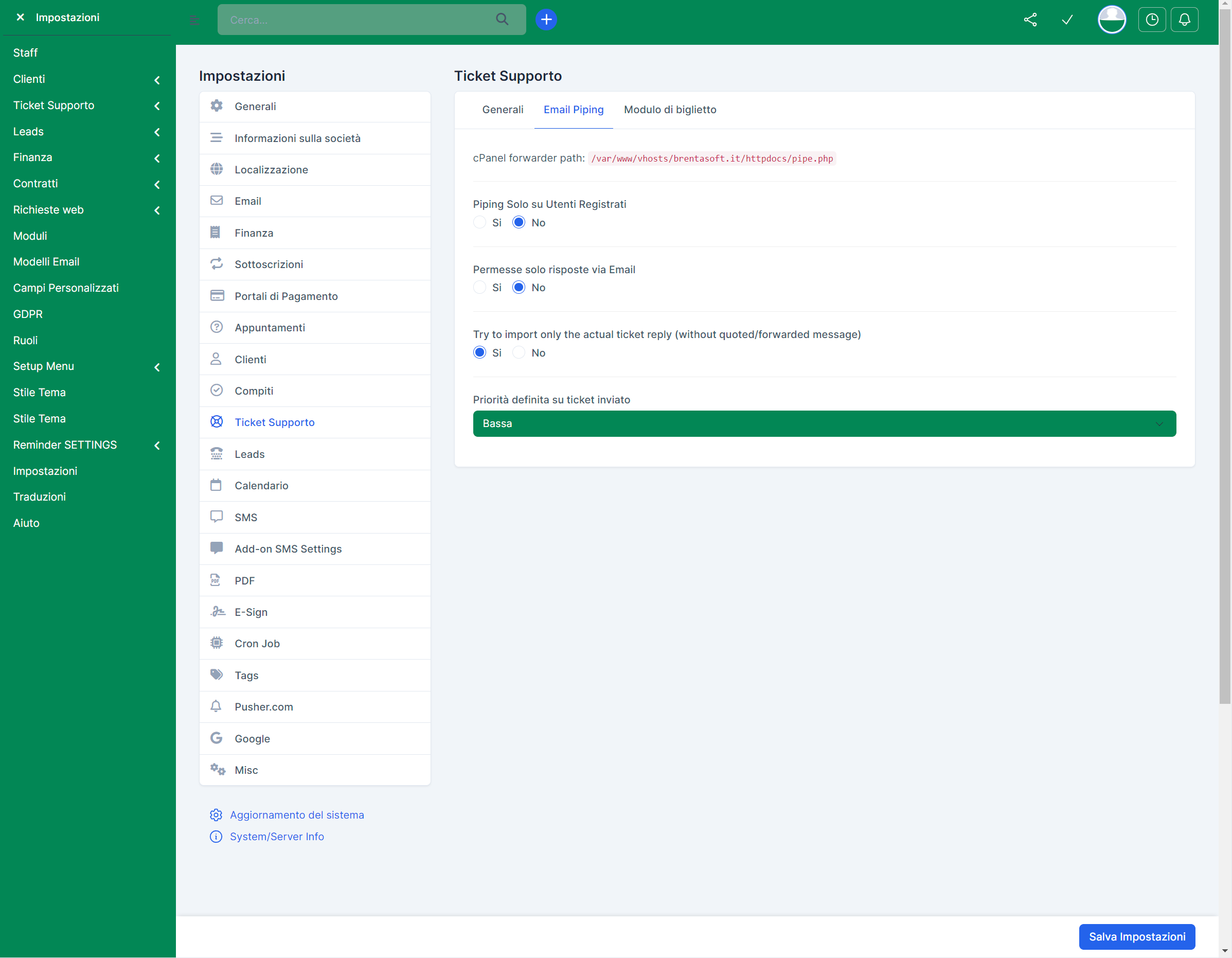 Dopo aver completato la configurazione dell'email piping, è importante salvare le impostazioni facendo clic sul pulsante "Salva Impostazioni". Questo assicura che le email inviate all'indirizzo configurato verranno automaticamente convertite in ticket di supporto, consentendo al tuo team di gestire le richieste in modo più efficiente e tracciabile.