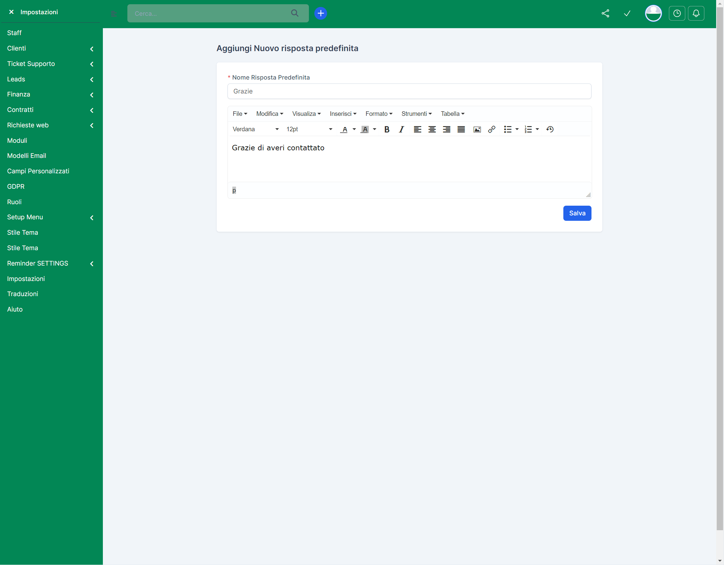 Una volta inserito il testo desiderato, clicca su "Salva" per aggiungere la risposta predefinita al tuo sistema. Questo ti permetterà di rispondere rapidamente ai ticket di supporto selezionando la risposta predefinita dal menu a tendina quando gestisci un ticket, garantendo consistenza nelle comunicazioni e migliorando l'efficienza del supporto al cliente.