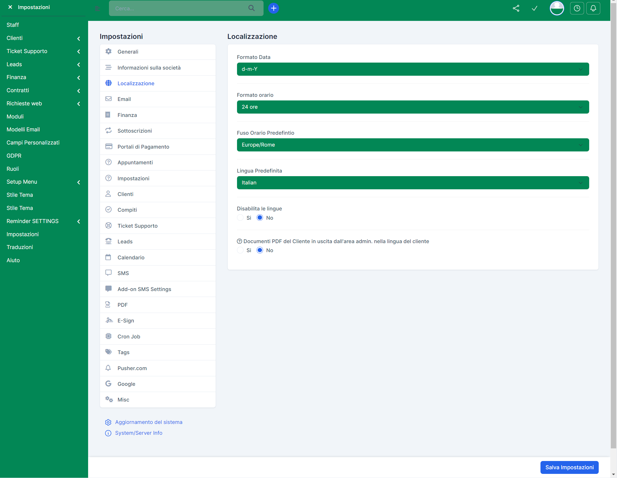 - Fuso Orario Predefinito: Seleziona il fuso orario appropriato per la tua attività, come "Europe/Rome".