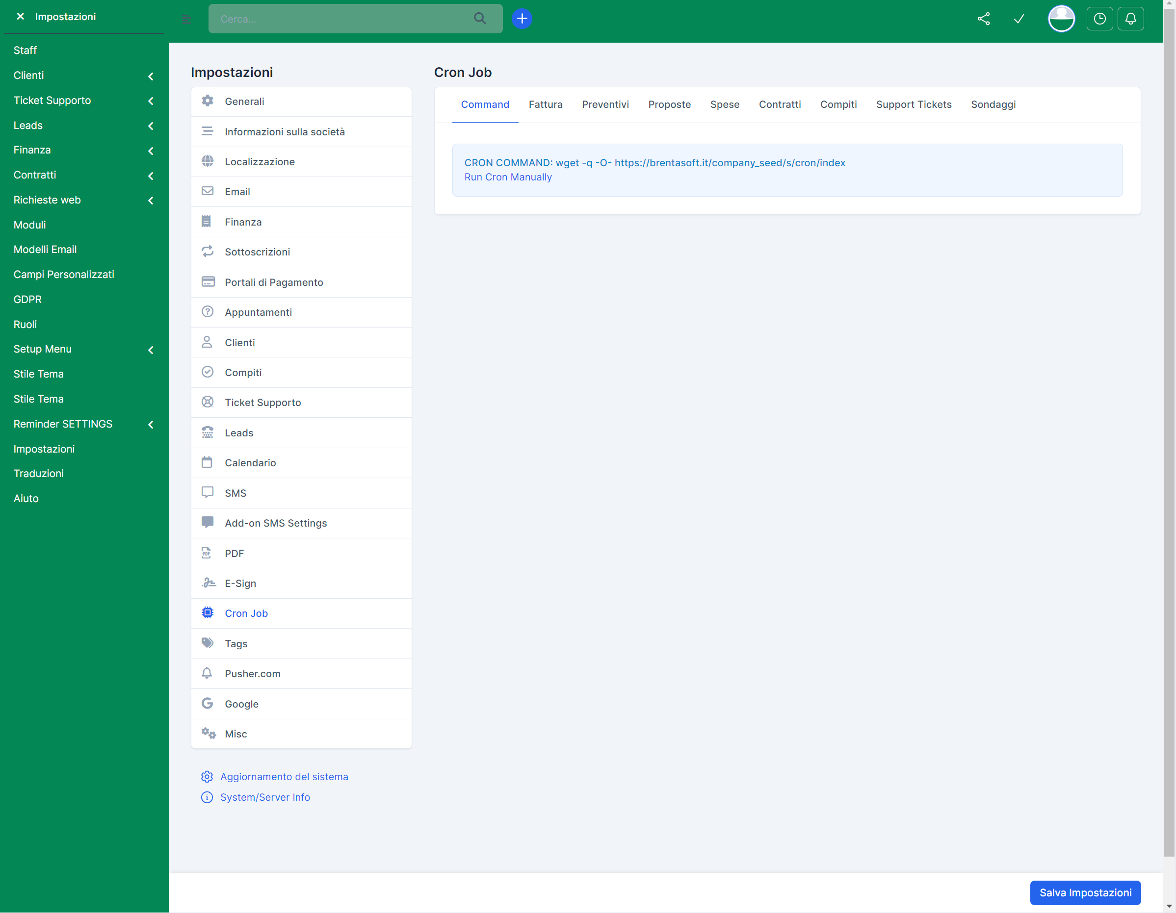 I Cron Jobs sono compiti automatizzati pianificati che eseguono operazioni periodiche all'interno del sistema BrentaSoft. Queste operazioni possono includere l'invio di promemoria via email, l'aggiornamento di stato dei ticket, la fatturazione automatica, ecc. Ecco come impostare un Cron Job in BrentaSoft: